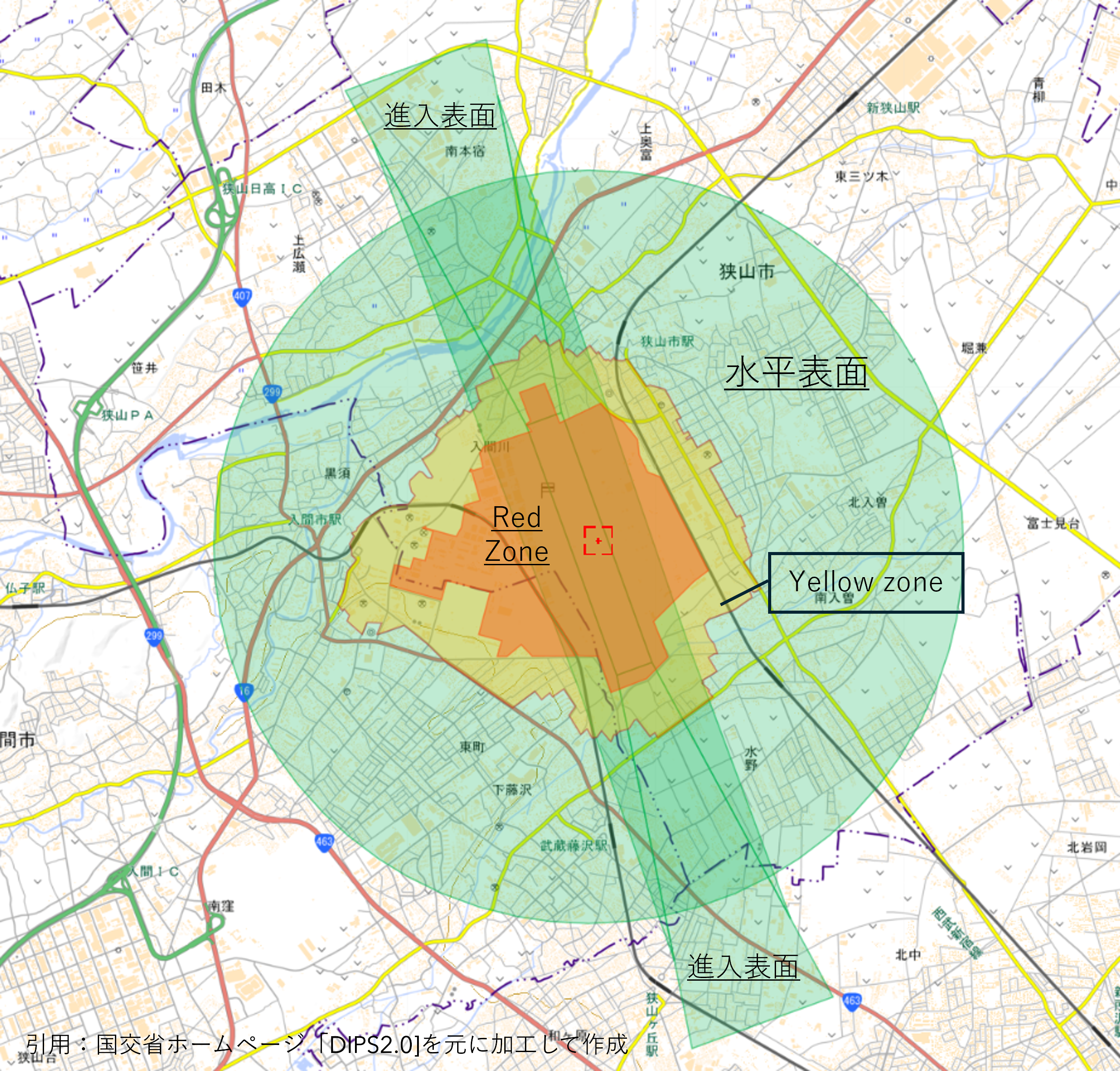 この範囲は、ドローンの飛行高度や速度、製造者が算定した落下距離などのデータをもとに設定されます。飛行前に現場を確認し、この区画内に道路や鉄道、家屋など人がいる可能性のある場所が含まれる場合は、さらに追加の対策が必要になります。